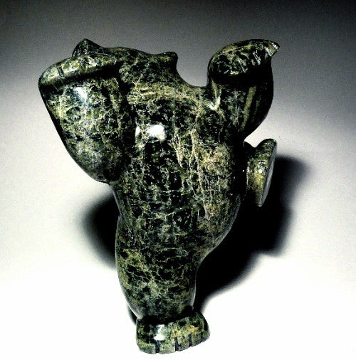 What strikes me the most about this gorgeous bear are the voluptuous curves. The roundness of the carving instantly puts me in a good mood when I look at it. Markoosie Papigatok is also very talented artist and specializes in dancing bears. His style for dancing bears is to accentuate the curves and to use beautiful colorations with the stone. This is what attracts Inuit art enthusiasts to his works. This dancing bear is perfectly balanced, large and impressive. It measures 8" tall, 7" wide.